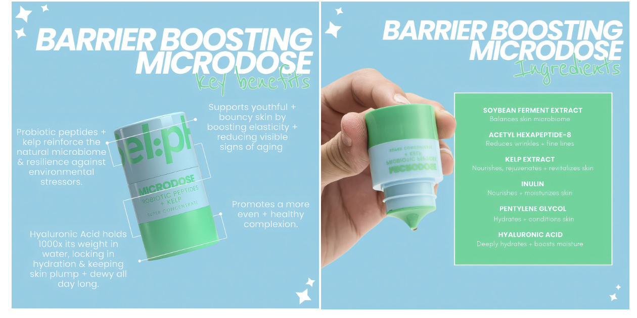 Above: Barrier Boosting Microdose: with Probiotic Peptides and Kelp to fortify and rebalance the skin barrier R429